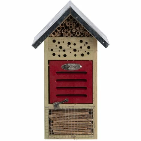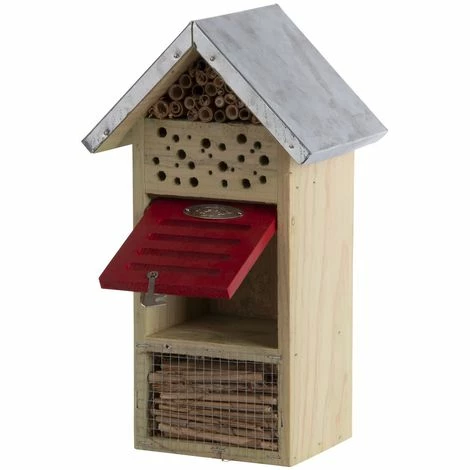Das Fach mit der roten Klappe bietet Florfliegen, MarienkĂ€fern und OhrwĂŒrmern Schutz und Unterkunft. FĂŒllen Sie das Fach mit feinem Weizenstroh, und geben Sie den Tieren so von Mitte September bis Anfang April eine Ăberwinterungsmöglichkeit.