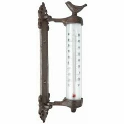 „Repräsentatives, großes Wandthermometer mit Halter aus Gusseisen und einem Vogelmotiv als Dekoration.