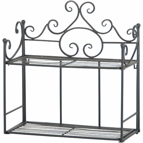 Ein wunderschöner schwarz beschichteter Pflanzenständer mit anmutigen Locken. Dieses zweistufige Präsentationsregal ist ein großartiger Ort, um Blumentöpfe, Kräuter und Zimmerpflanzen auszustellen.