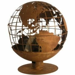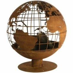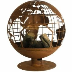 Der runde Feuerball hat lasergeschnittene Formen der Weltkugel, die mit den Flammen ein schönes Schauspiel ergeben. Dieser Feuerstellen-Kugel wird durch Feuer, Wetter und Zeit rostiger, was die Patina noch authentischer macht. Das lasergeschnittene Design und die große Öffnung ist perfekt zum Platzieren von Holz.