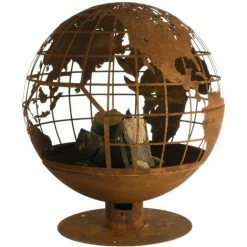 Der runde Feuerball hat lasergeschnittene Formen der Weltkugel, die mit den Flammen ein schönes Schauspiel ergeben. Dieser Feuerstellen-Kugel wird durch Feuer, Wetter und Zeit rostiger, was die Patina noch authentischer macht. Das lasergeschnittene Design und die große Öffnung ist perfekt zum Platzieren von Holz.